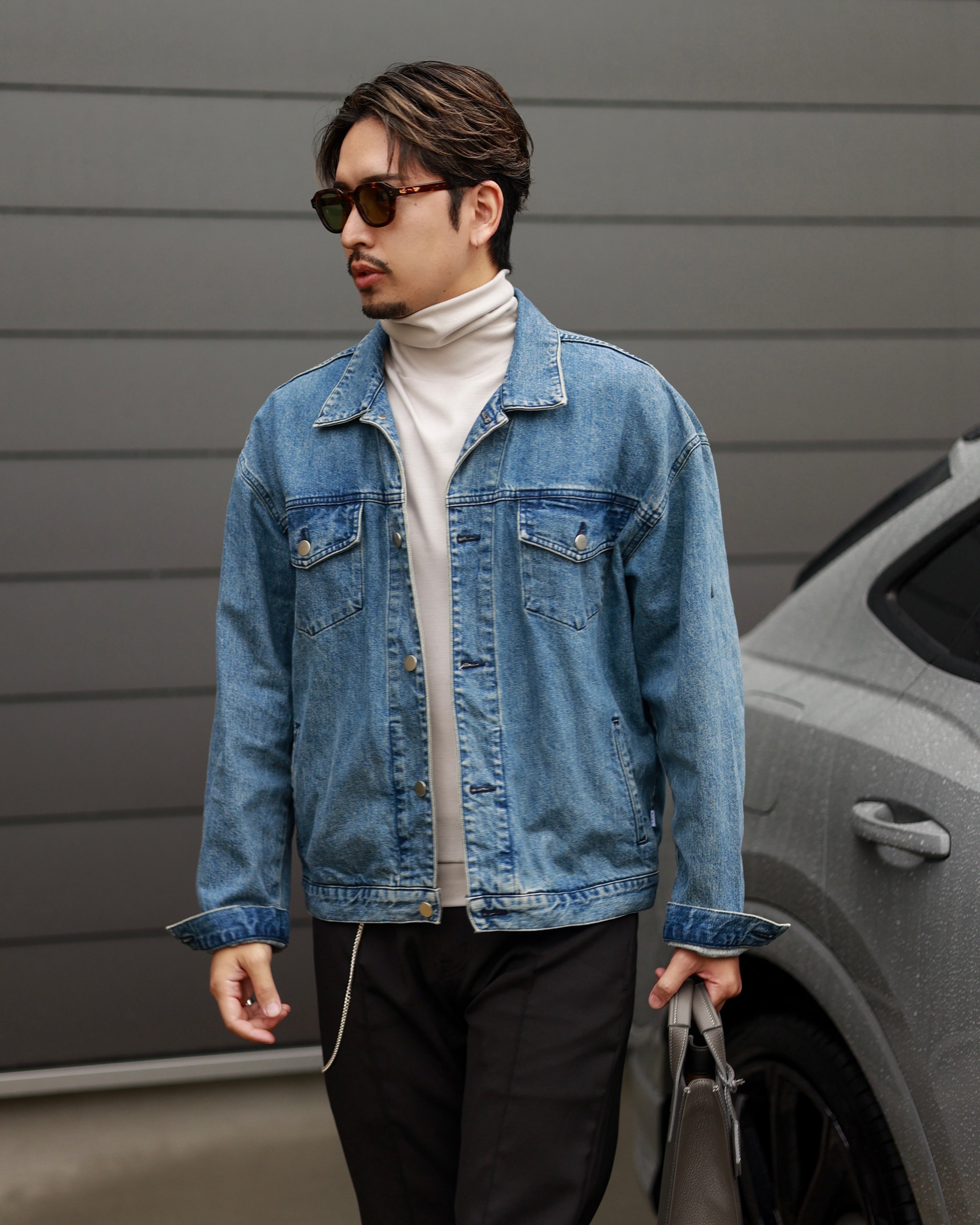 通常は極端に着丈が短いのが定番ですが、EUROKENVY®︎ のデニムジャケットは着丈もやや長めに設計する事で全体のバランスが非常に良くなるコーディネートしやすいパターン