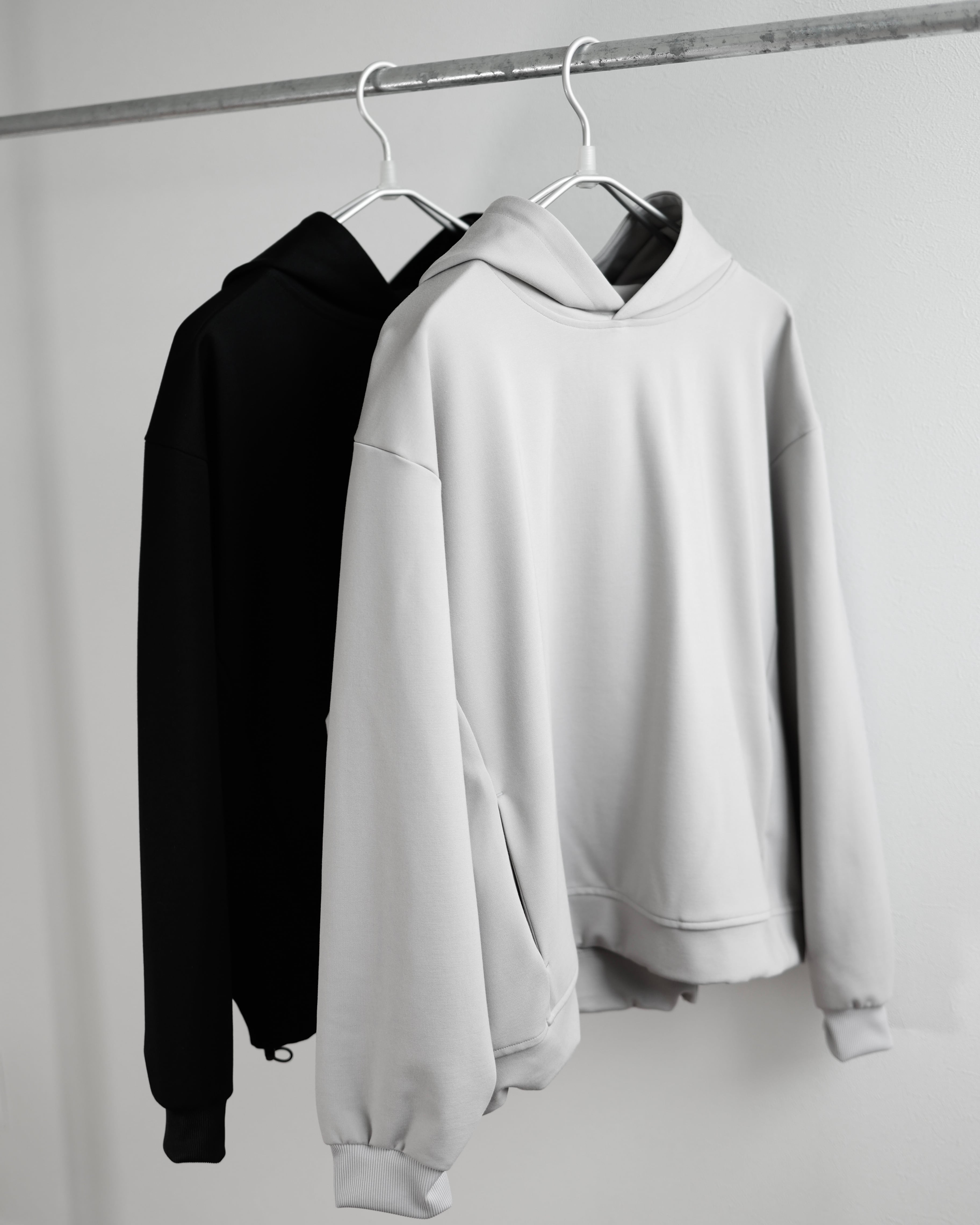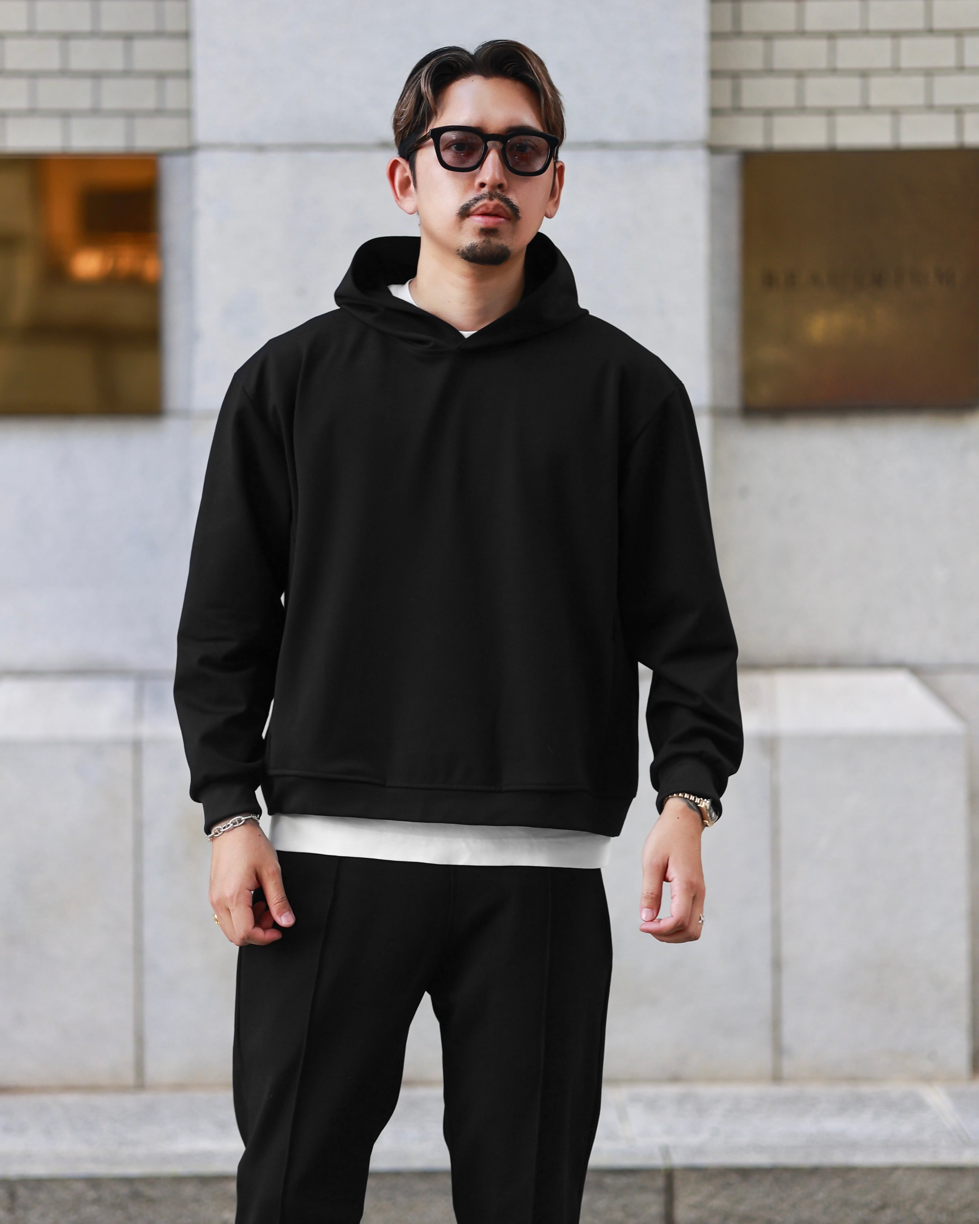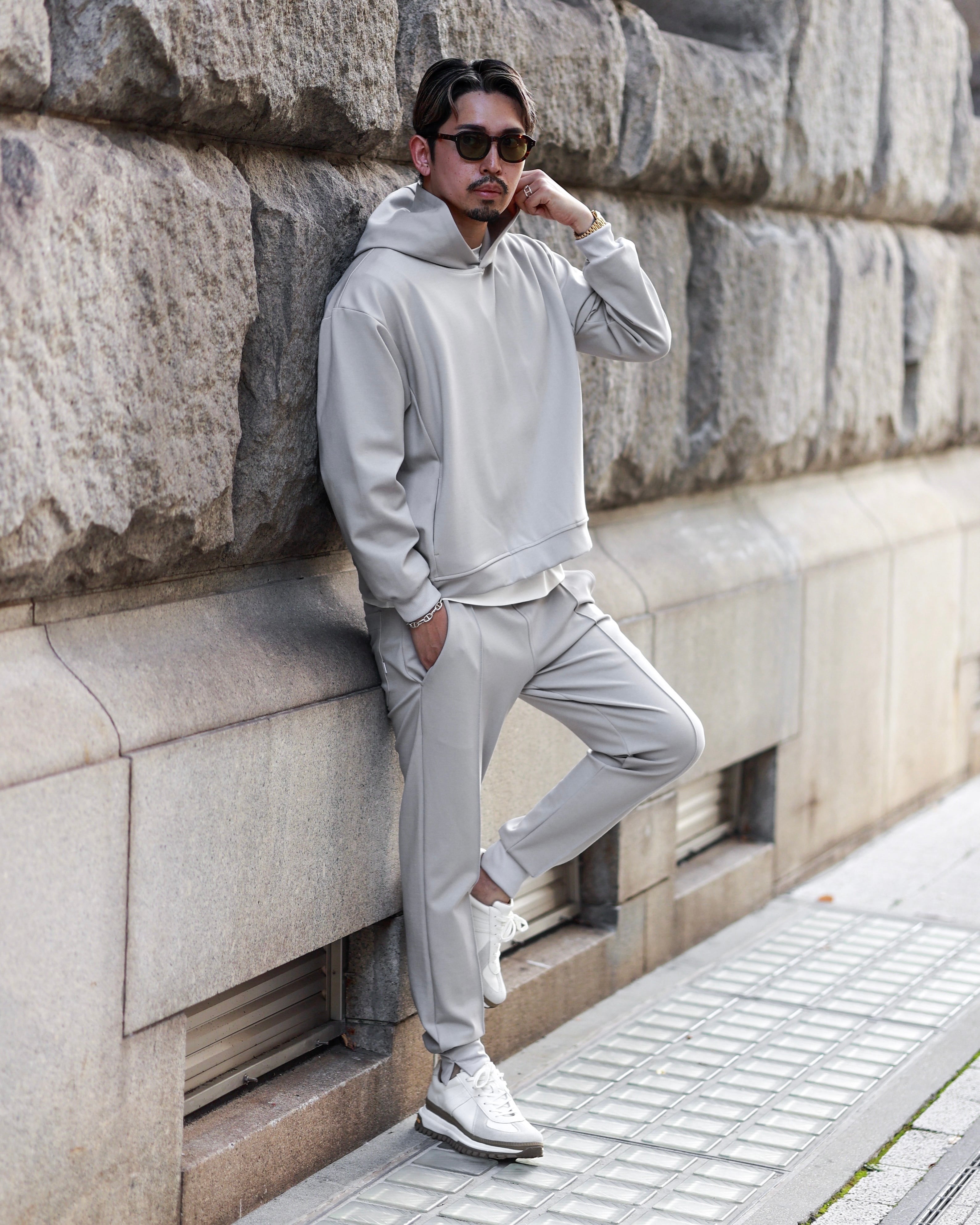 ツヤ、高級感のあるスーパーヘビーストレッチポンチ素材にボックスシルエットと着丈はややショート丈でフーディと、スタイリッシュなラグスポパンツは相性が良く、白Tシャツ(レギュラーfitがオススメ)と合わせると大人のレイヤードスタイルに。
