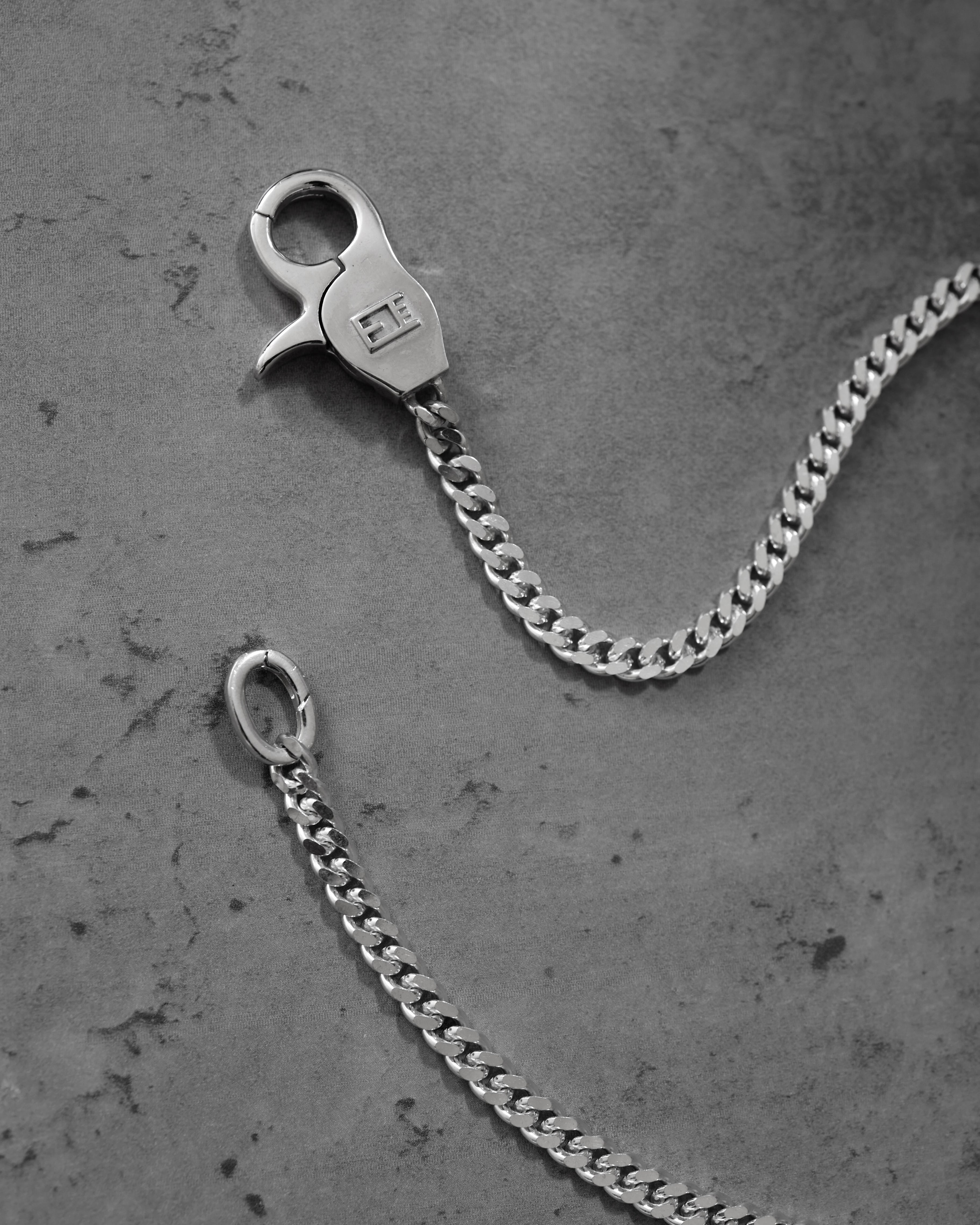 Silver925製のウォレットチェーンは喜平部分を目の詰まった5mm幅にすることで男らしさ以外にも品があり、悪目立ちしないのが特徴。