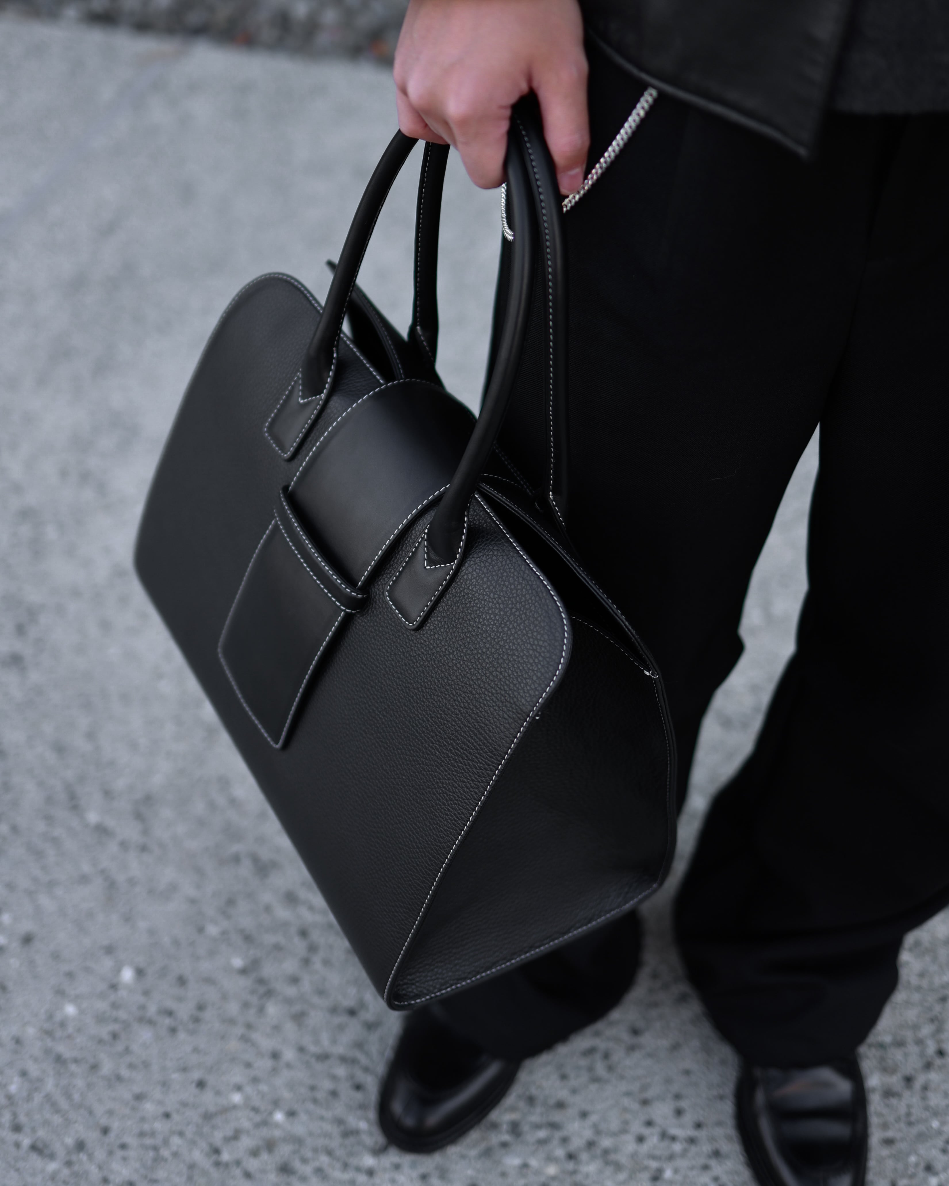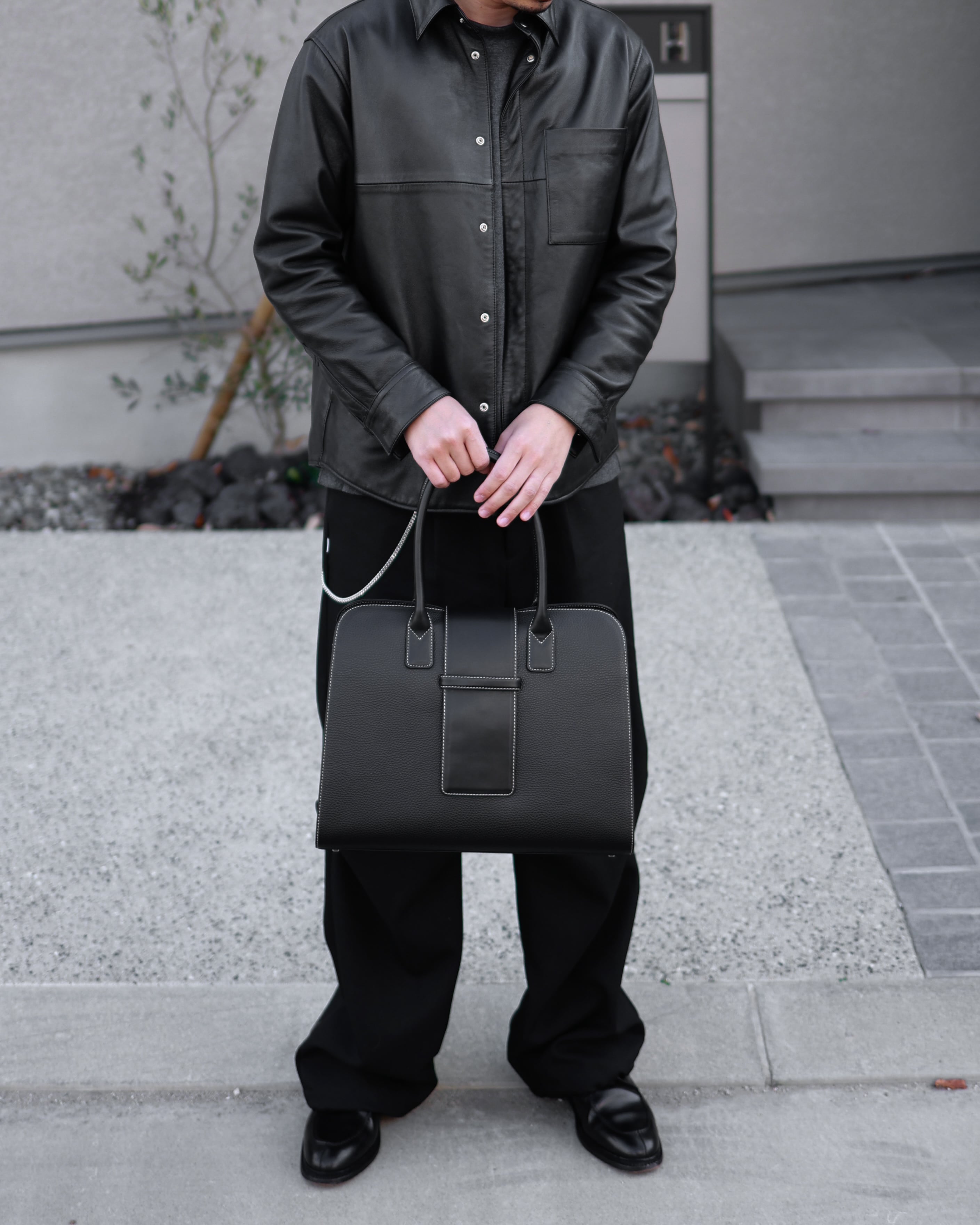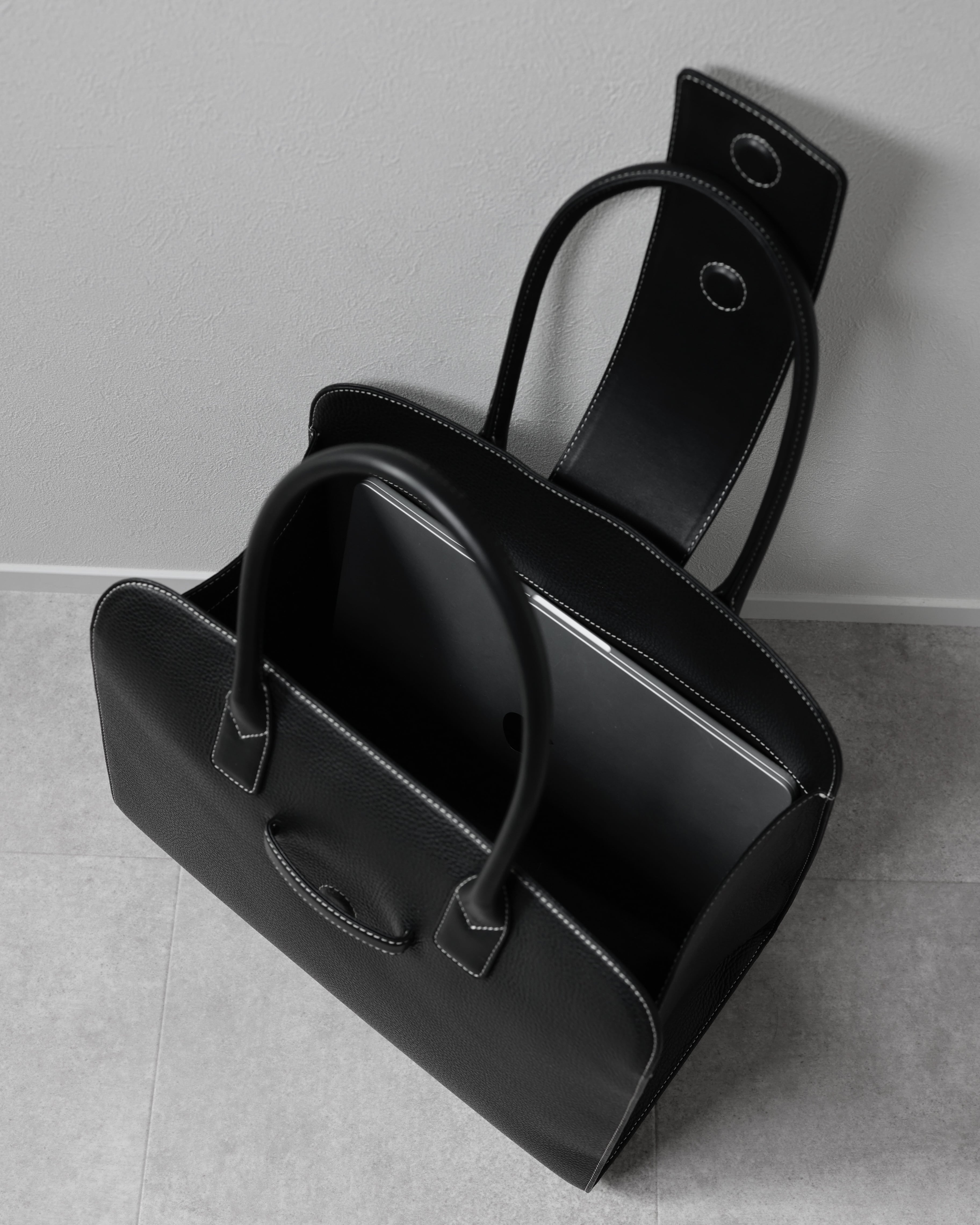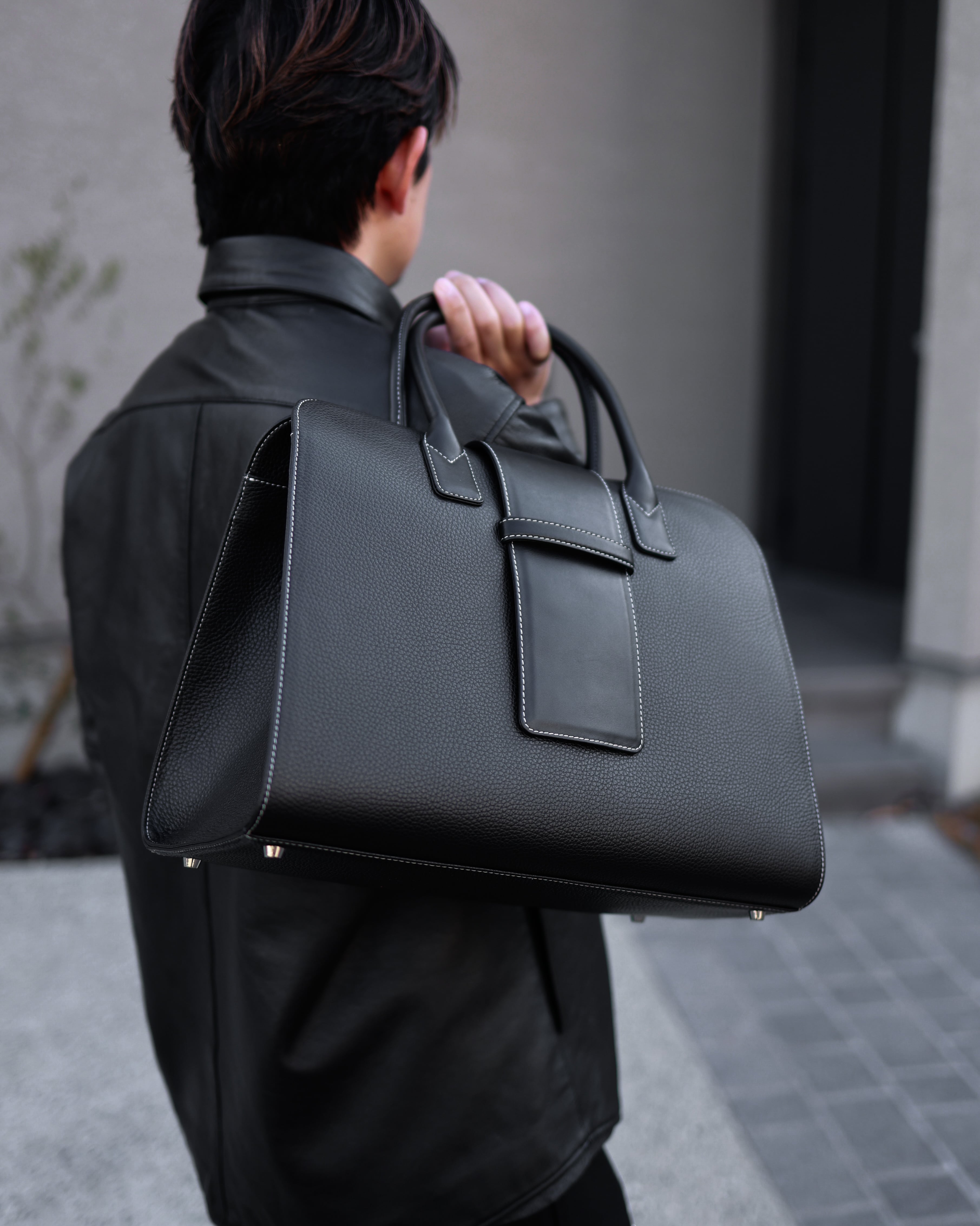 ボディには高級感のあるシボ加工を施し、ベロ部分、持ち手をスムースに。