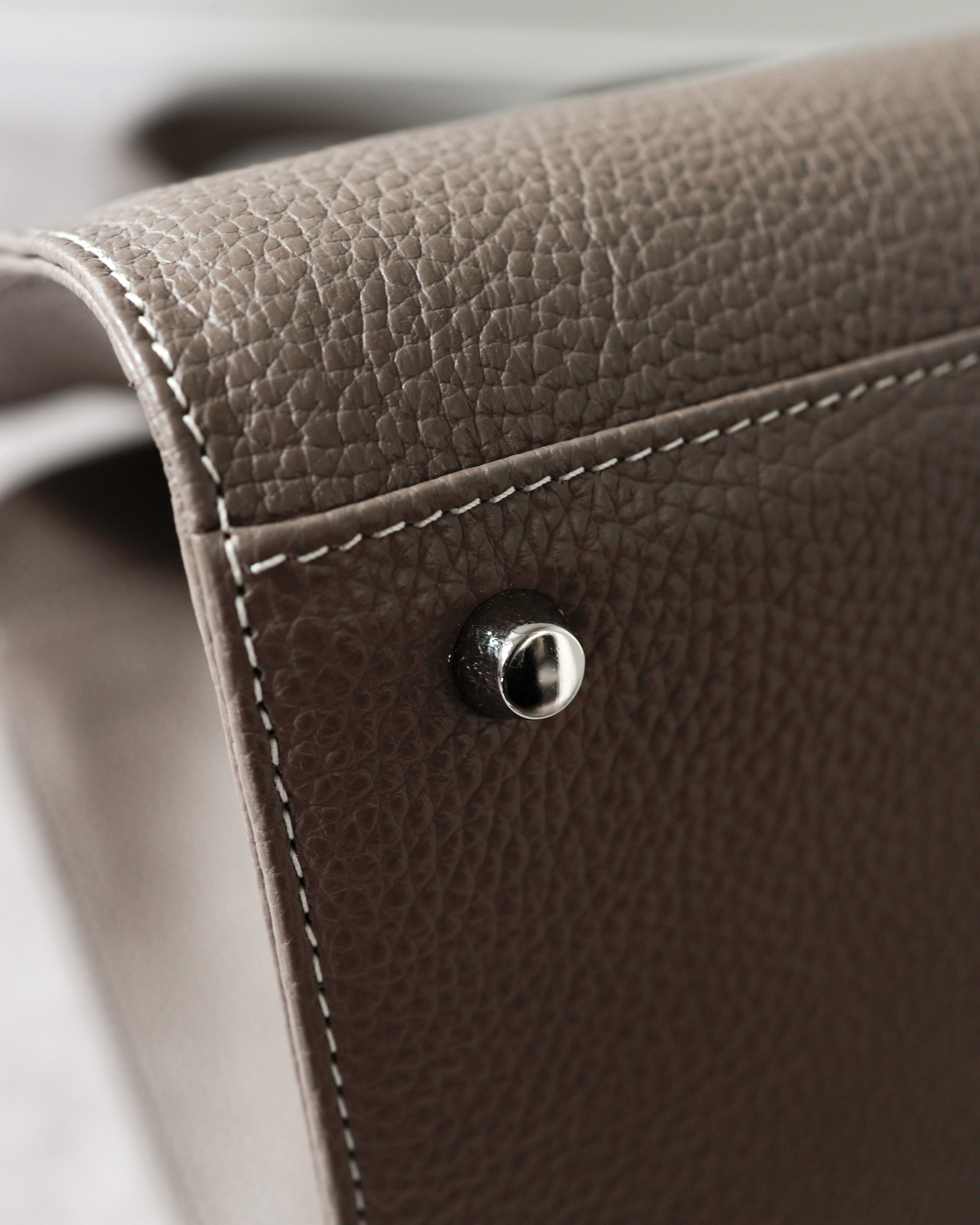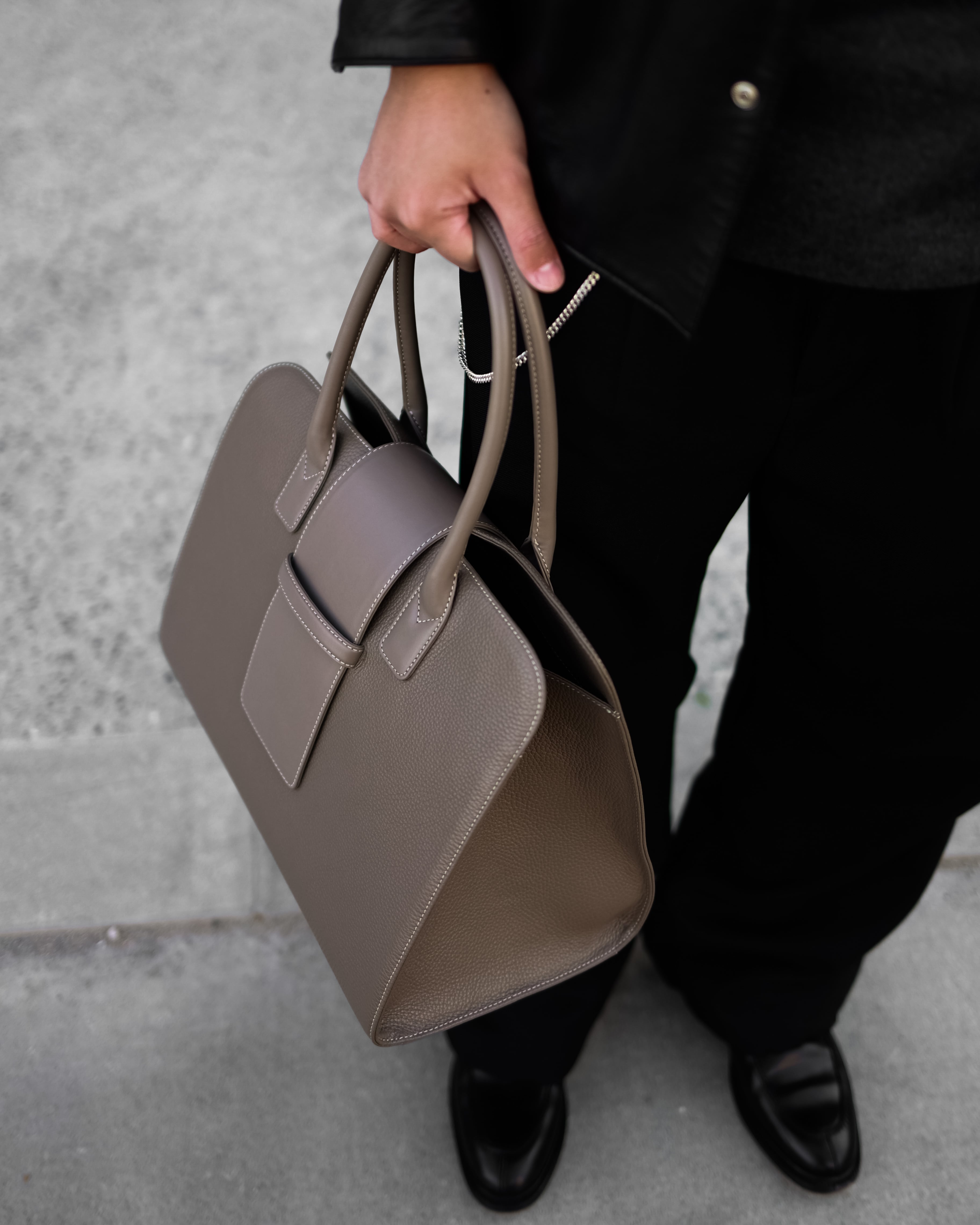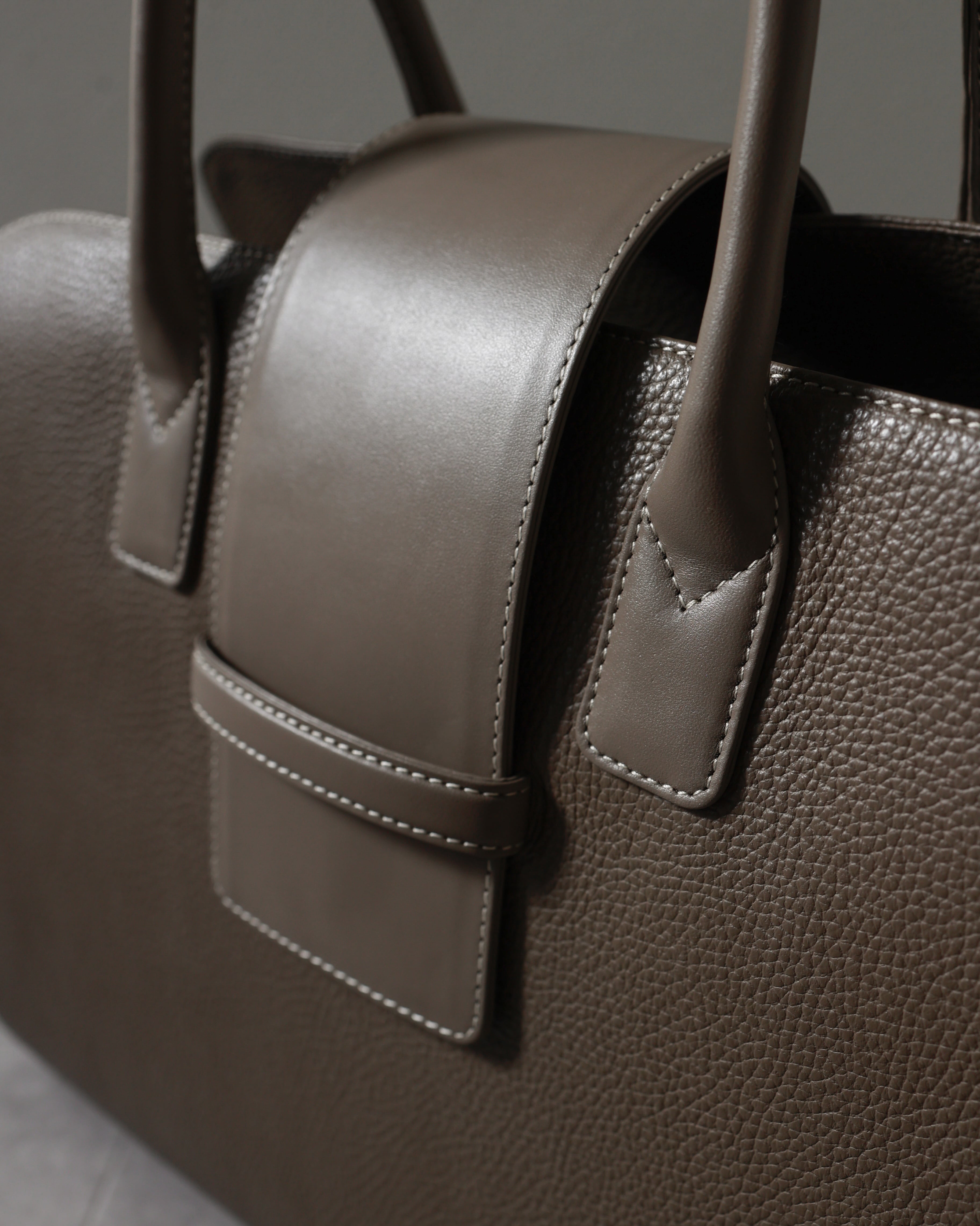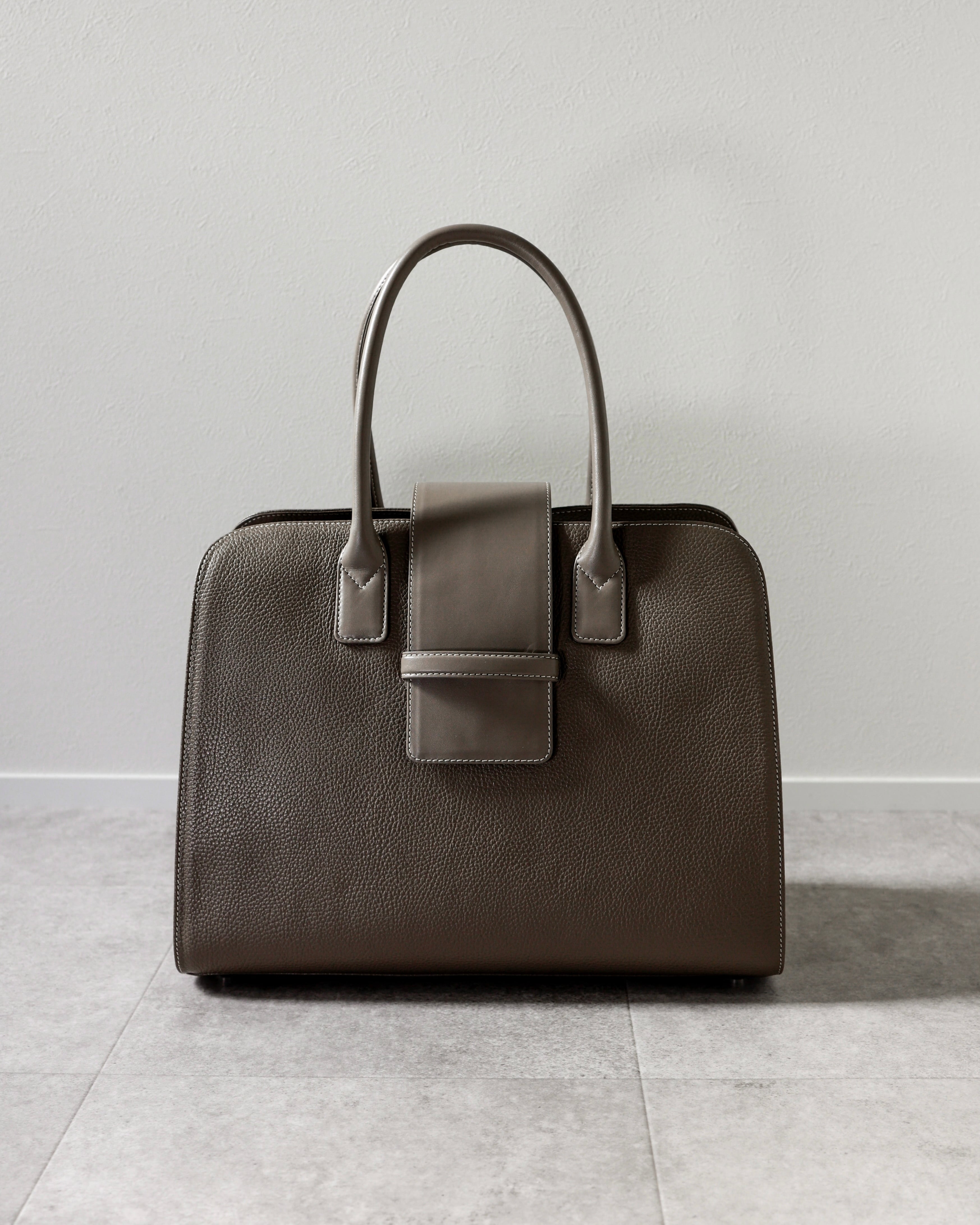 ボディには高級感のあるシボ加工を施し、ベロ部分、持ち手をスムースに。