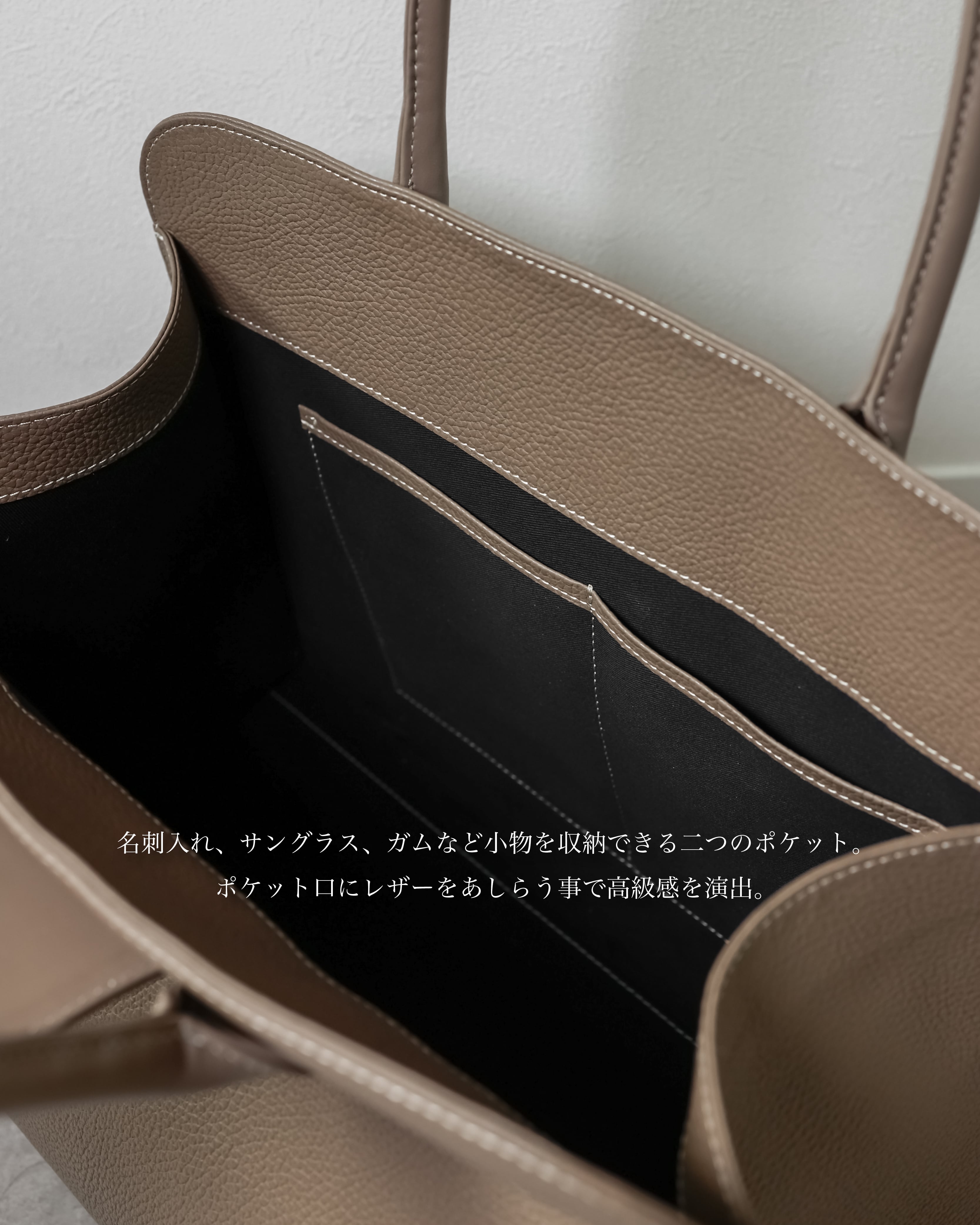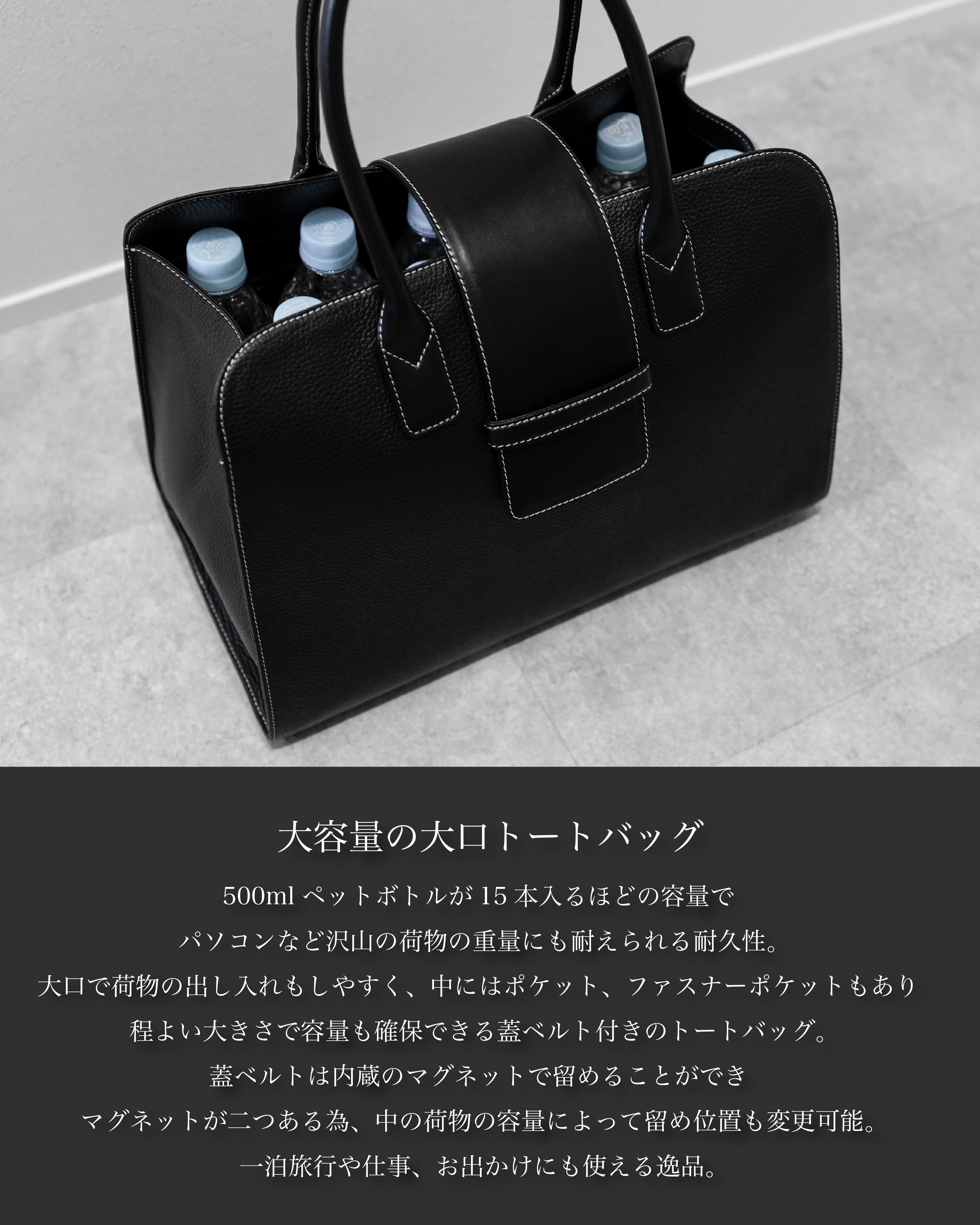 大口で荷物の出し入れもしやすく、中にはポケット、ファスナーポケットもあり程よい大きさで容量も確保できる蓋ベルト付きのトートバッグ。