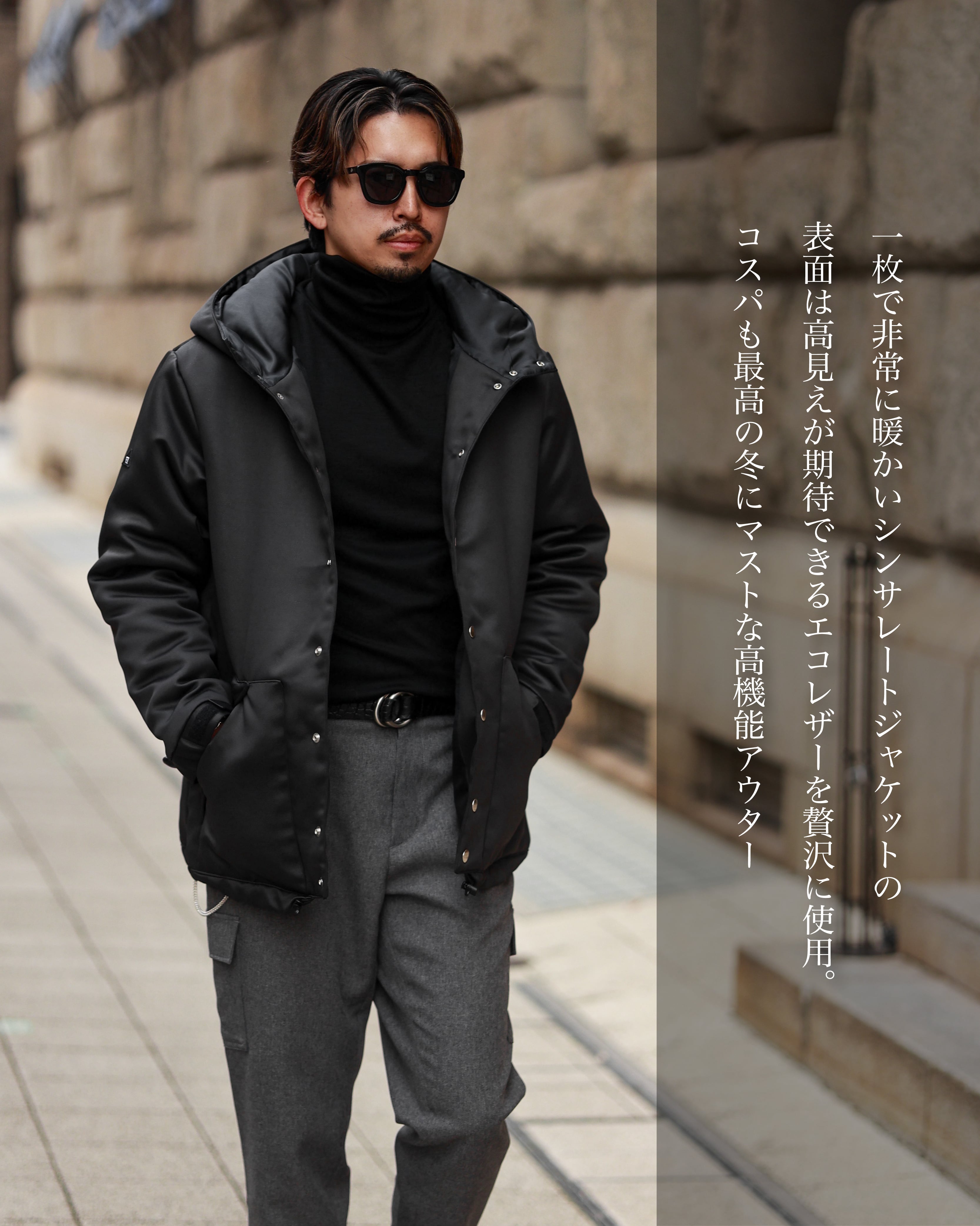 ダウンと同量で2倍暖かい素材となりますのでダウンのようにごわつく事なく、スマートに着用可能。