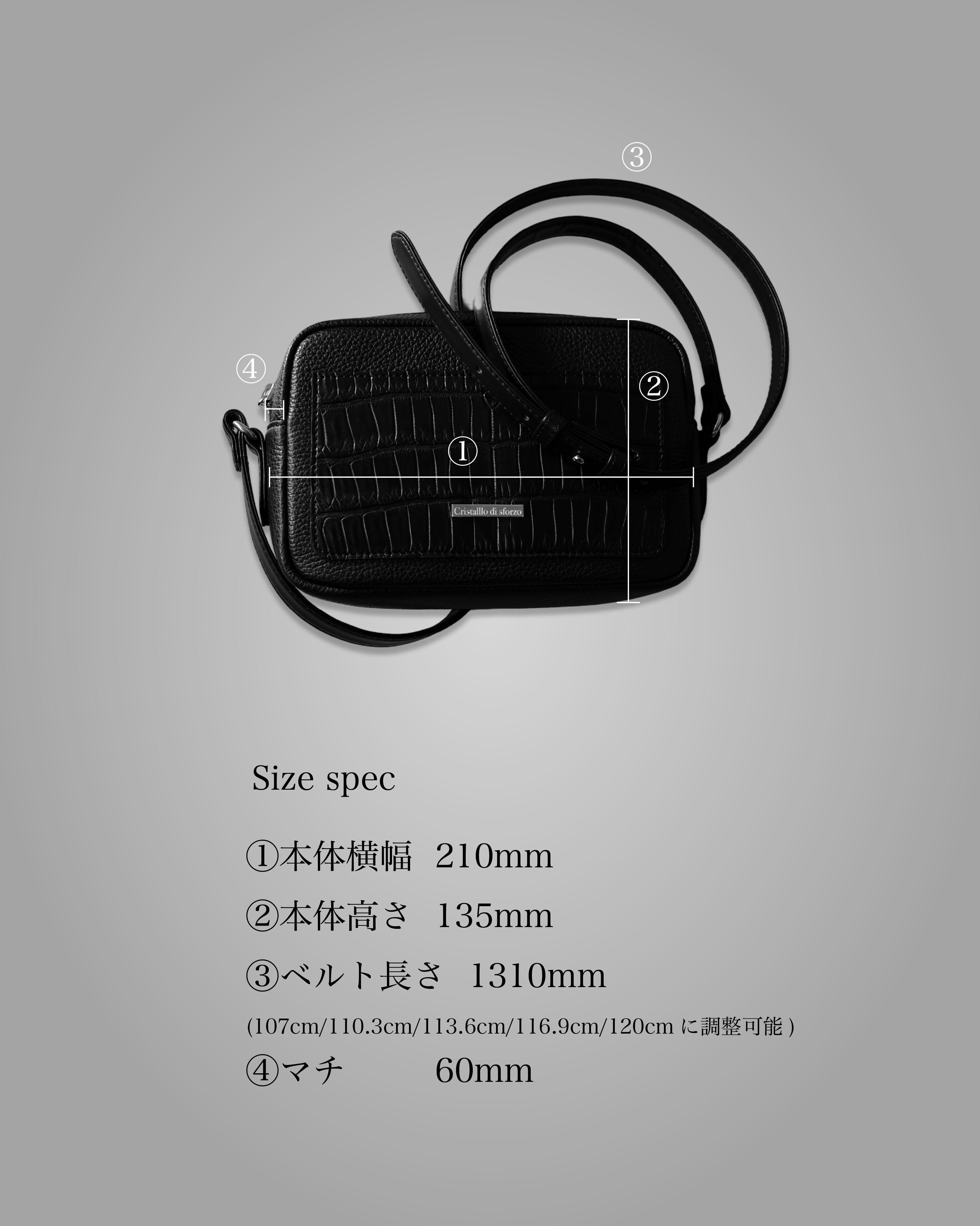 高さ135mm 横幅210mm マチ60mmベルト長さ1310mm (107cm/110.3cm/113.6cm/116.9cm/120cmに調可能