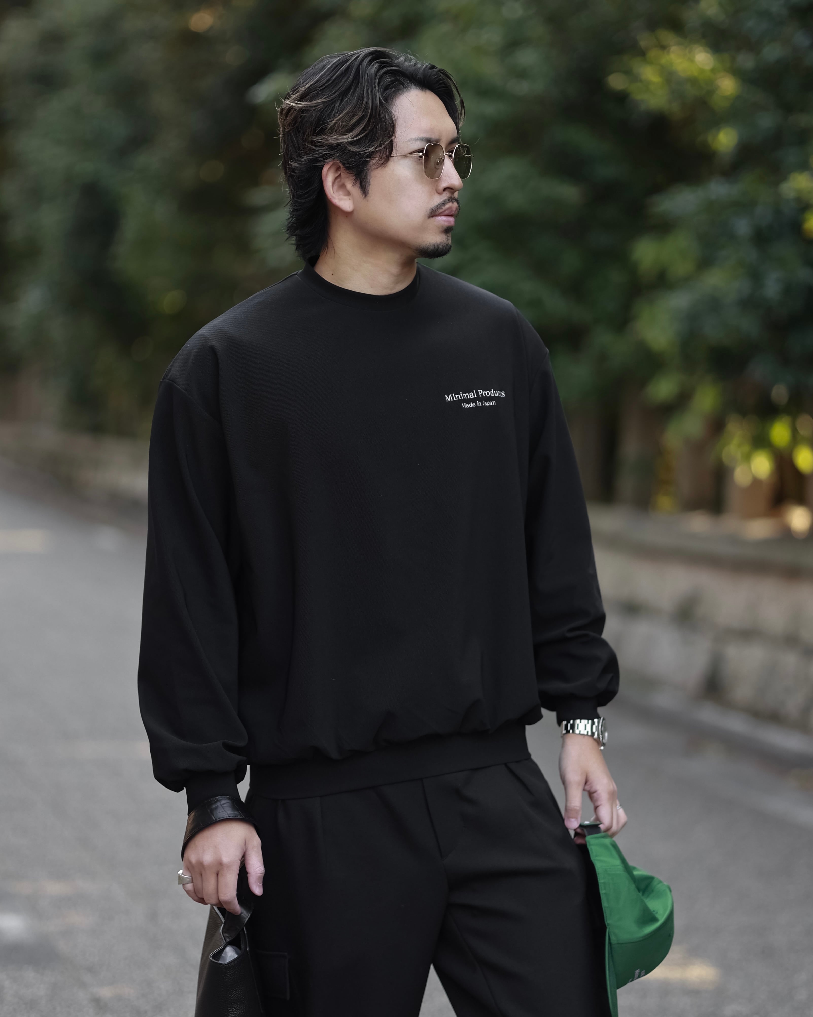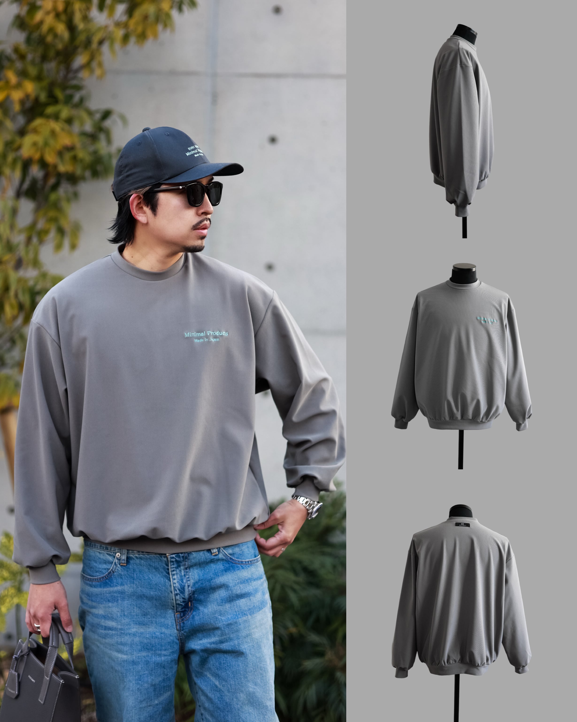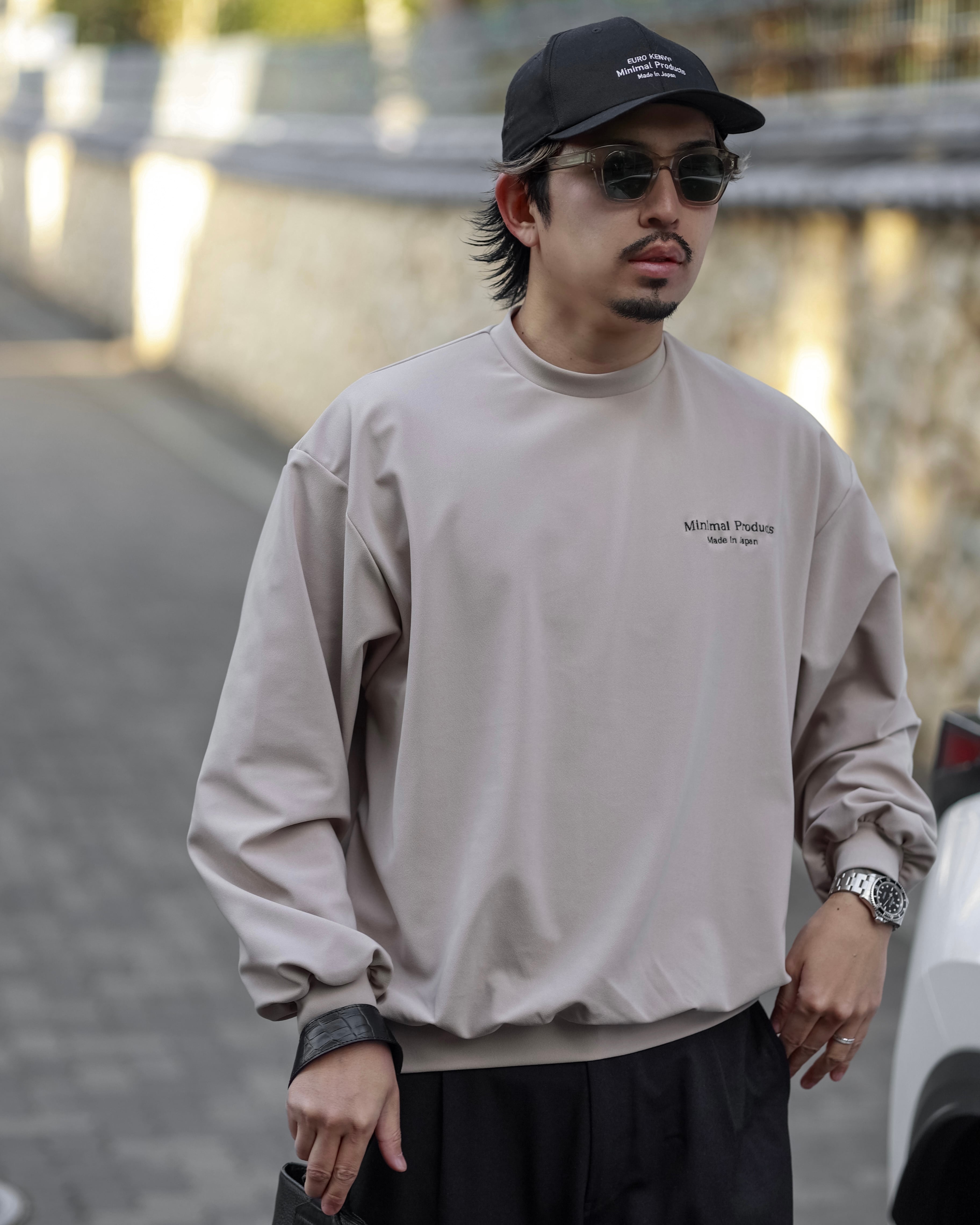 このロングスリーブはオーバーフィットながら、首元を詰め、裾、袖裾を細くすることでメリハリのあるバルーンシルエットに。