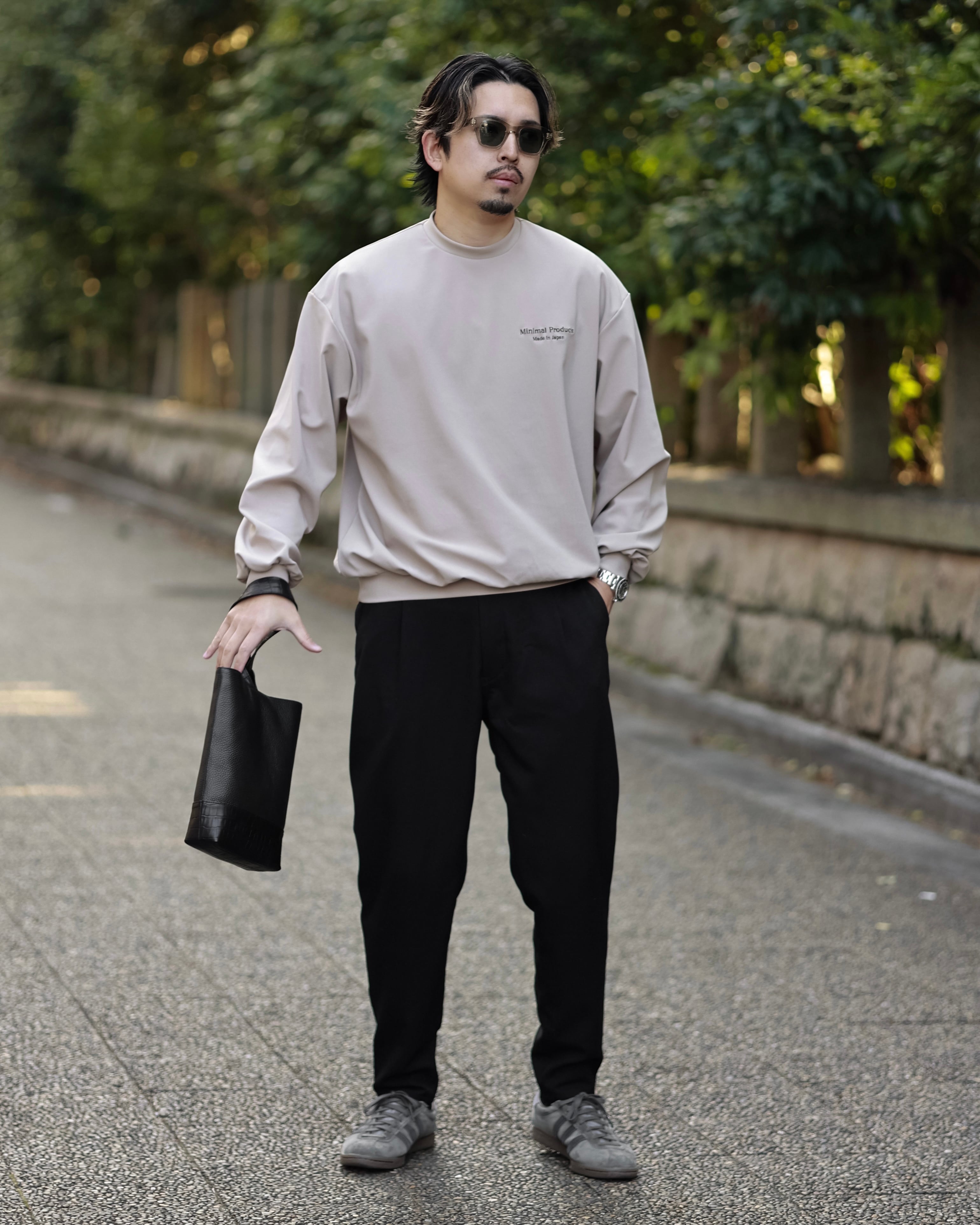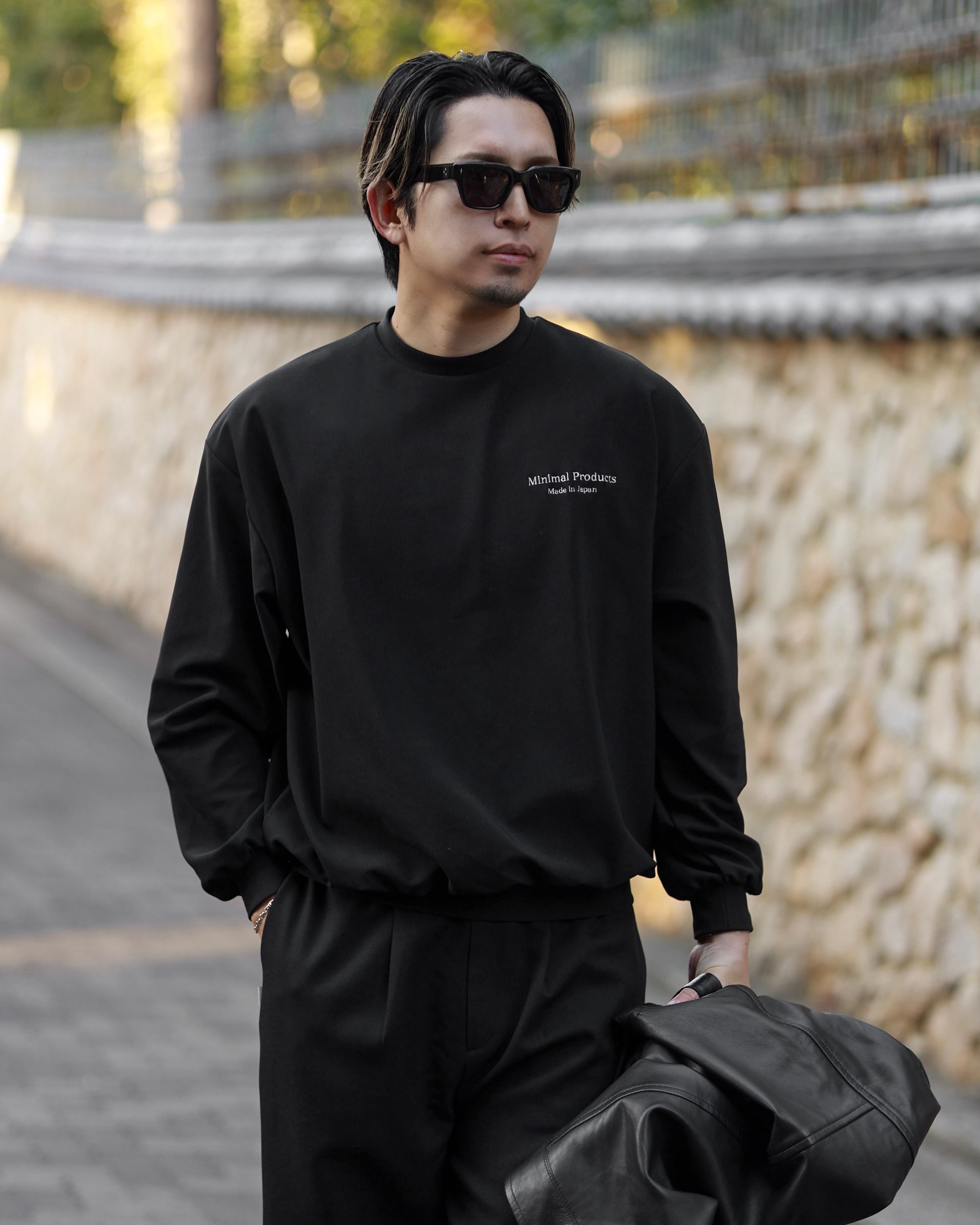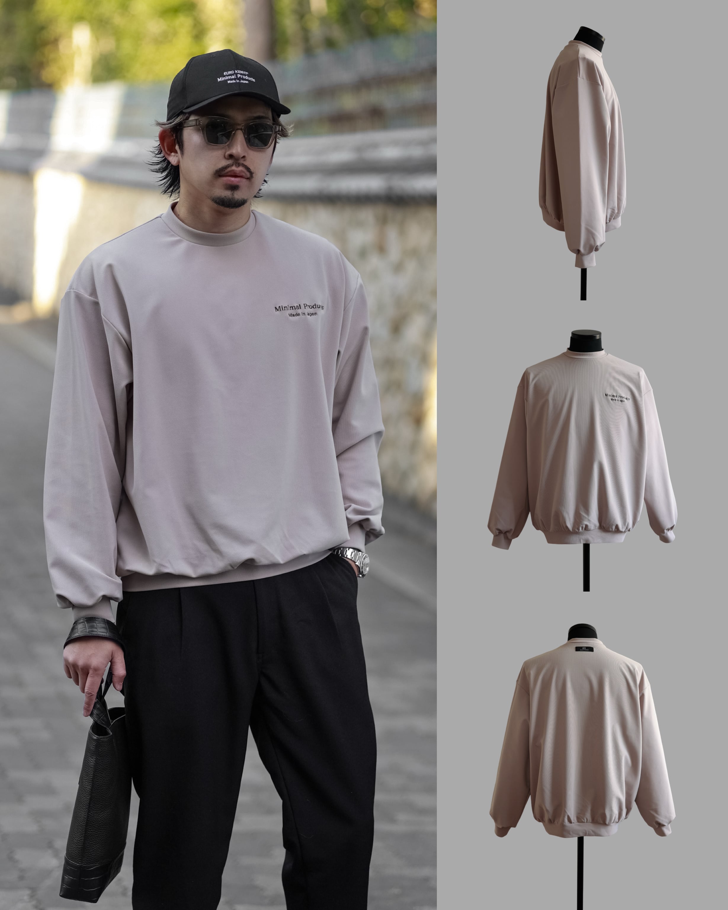 このロングスリーブはオーバーフィットながら、首元を詰め、裾、袖裾を細くすることでメリハリのあるバルーンシルエットに。